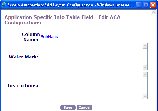 Use the Citizen Access Configuration page to define the field labels, provide instructional text, or create watermarks for Custom Fields. This section provides details to help you to customize fields for Citizen Access. For more information on how to customize fields for Citizen Access, refer to the “Working with Web Pages” chapter in the Citizen Access Administrator Guide.