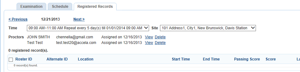 6. Use the Previous and Next buttons to view data for other exam dates. You can also use the Time and/or the Site field to filter the registered records by exam time and exam site.